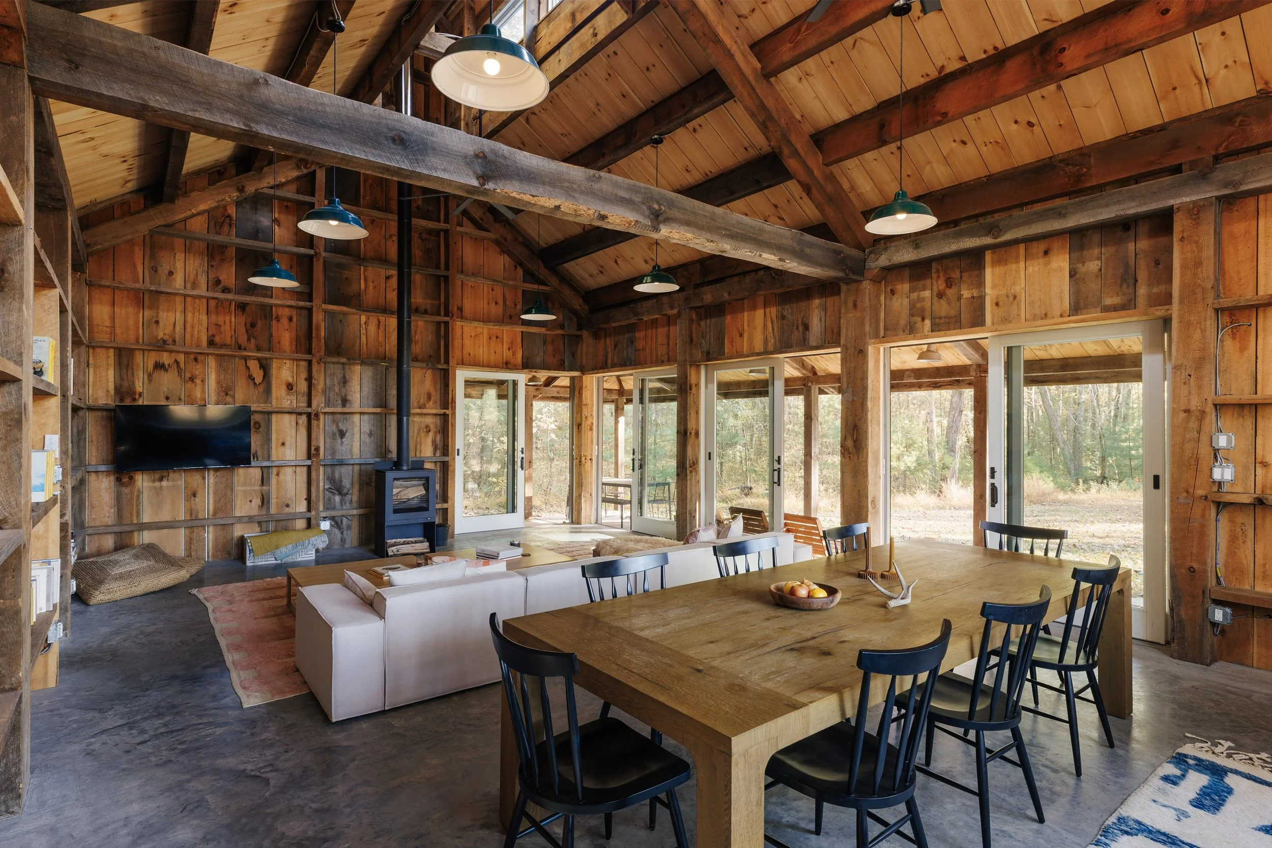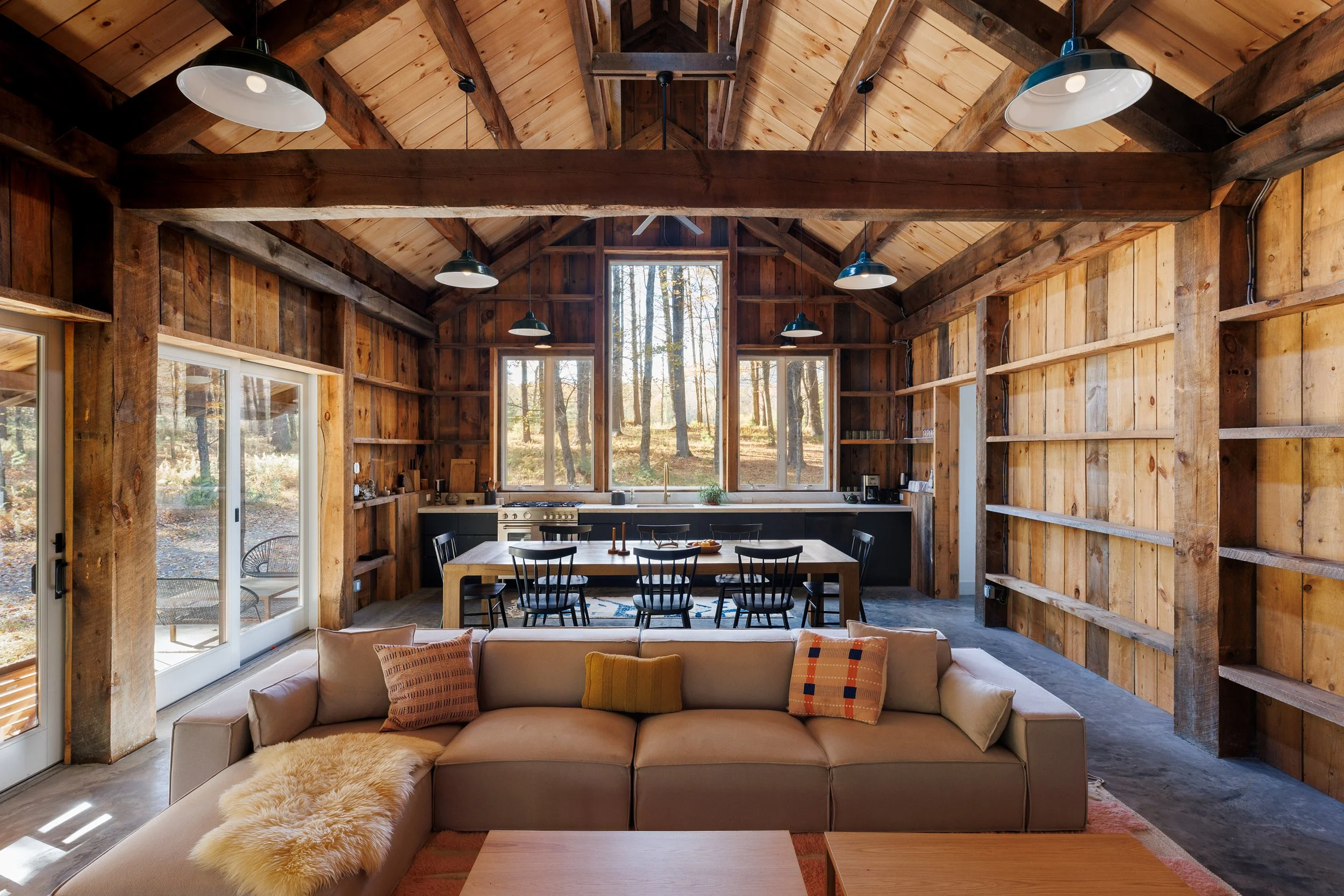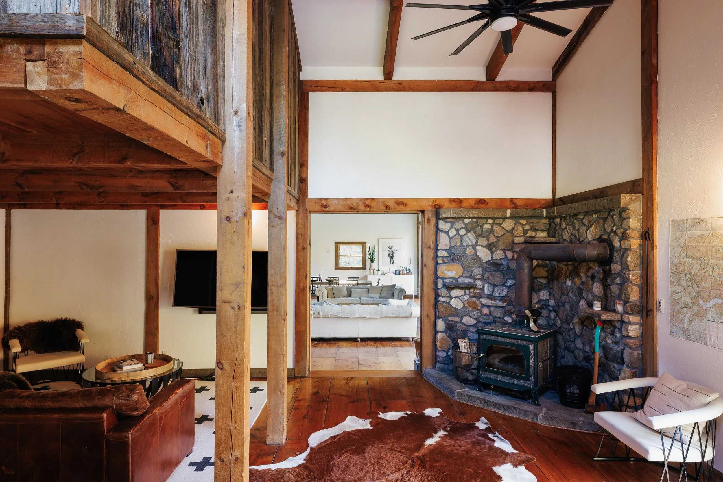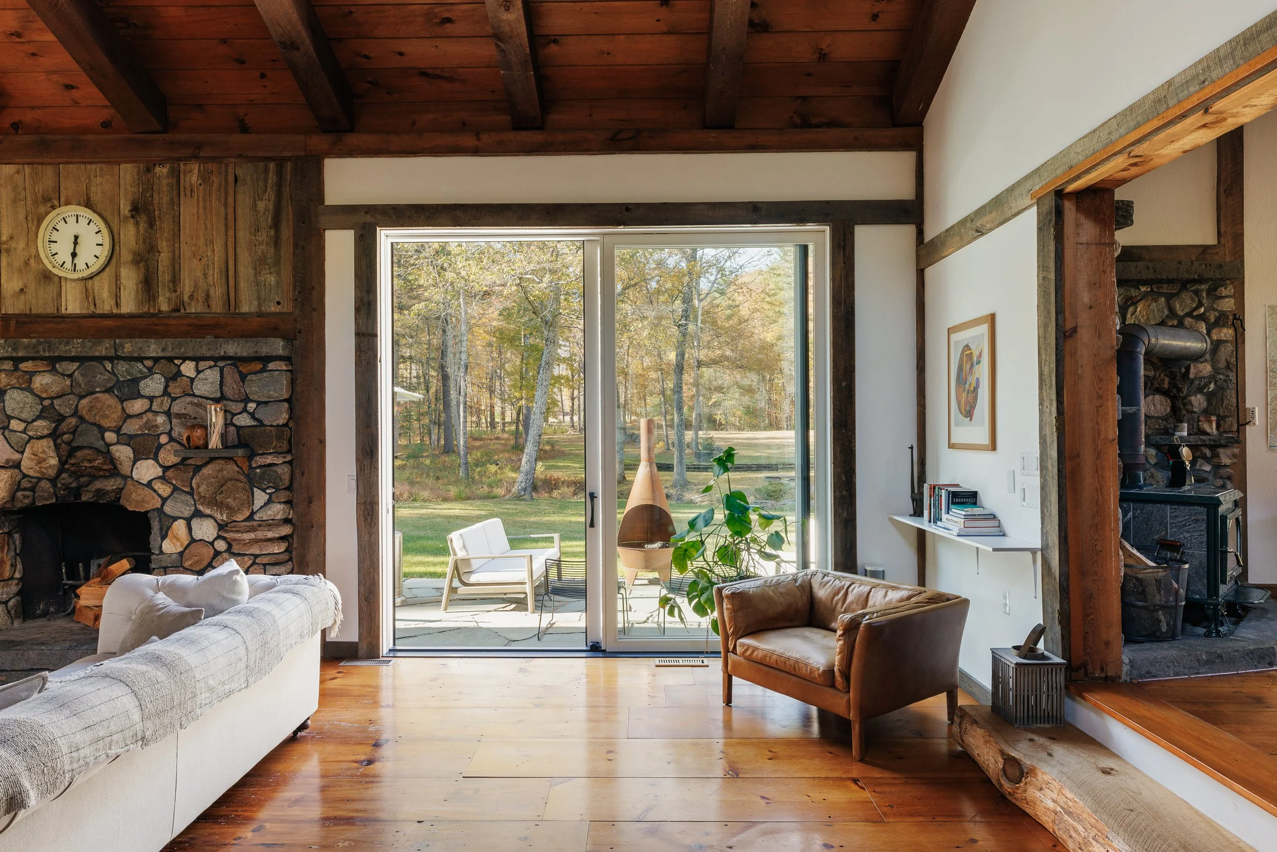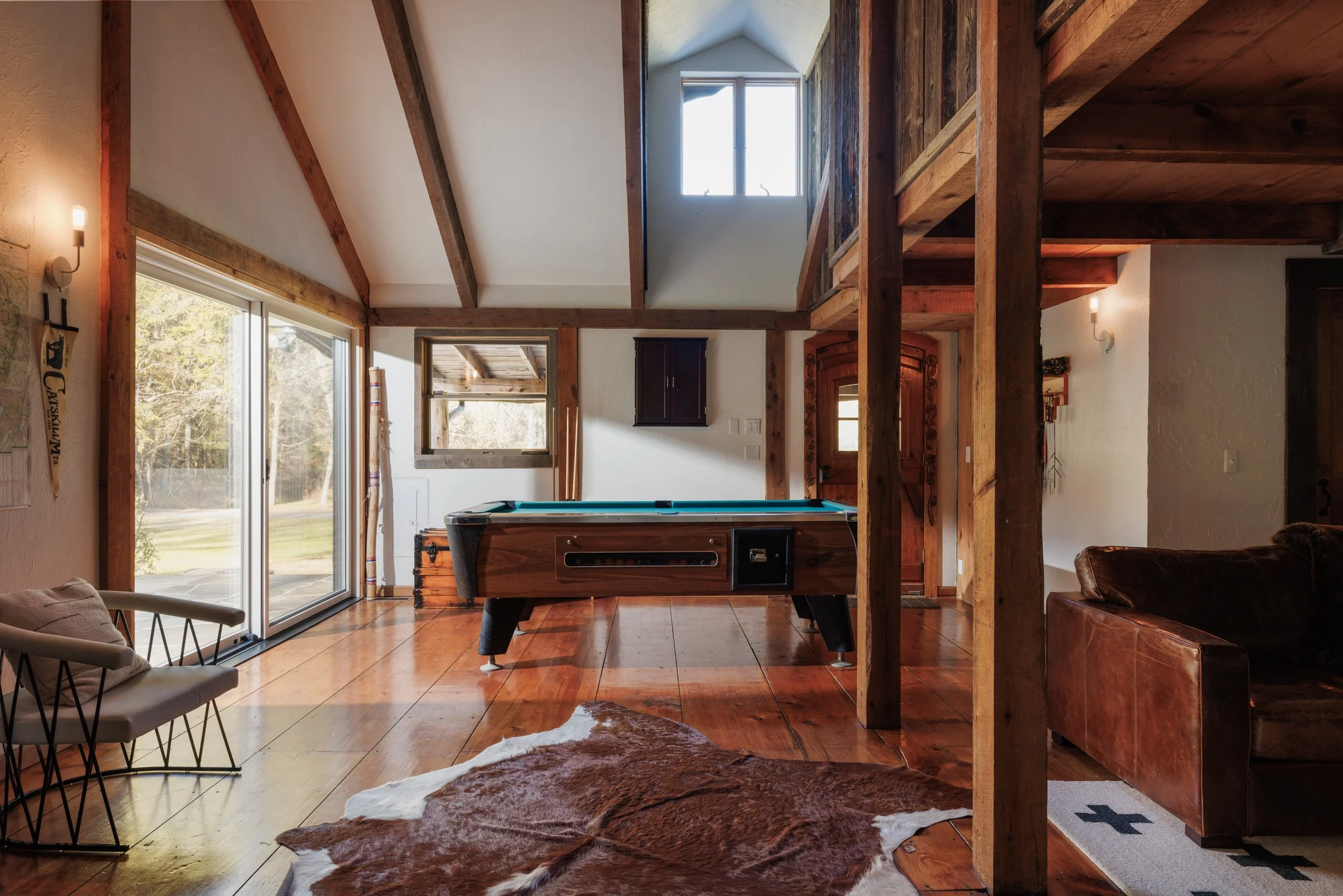 Nestled amongst the trees is a newly renovated guest house. Known as the “Sugar Shack”, it was once a barn where maple syrup was made. The structure has so much character having preserved much of the barn’s interior woodwork and shape while at the same time being essentially a new build. Complete with a new slab, new roof, radiant heat concrete floors, 30’ cathedral ceilings, a wood-burning stove, split units, new glass sliding doors, and an open modern kitchen with large windows framing spectacular views of Overlook Mountain. The Sugar Shack is nicely situated at a distance from the main house, so it’s perfect for rental income and has been successfully run as such.
