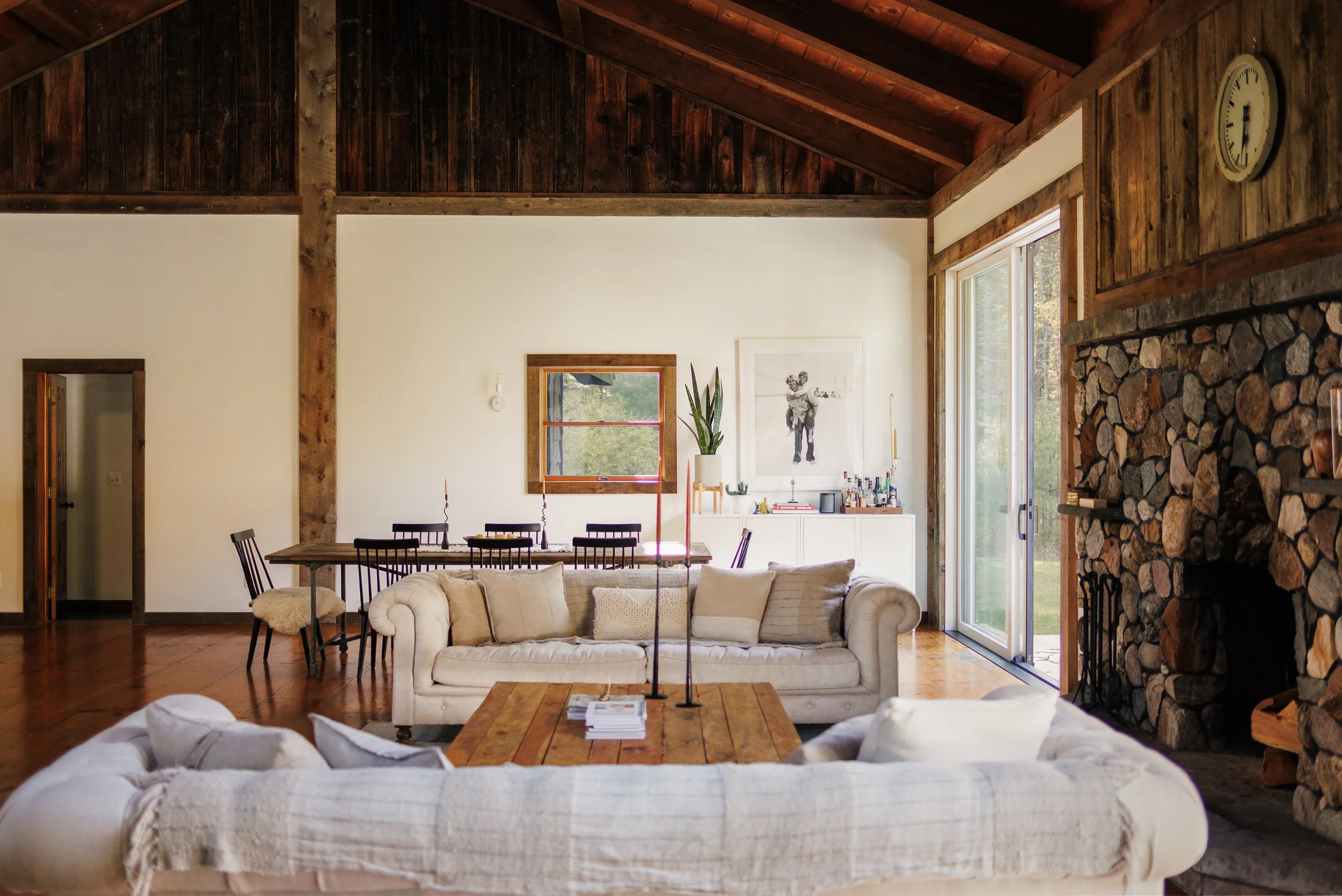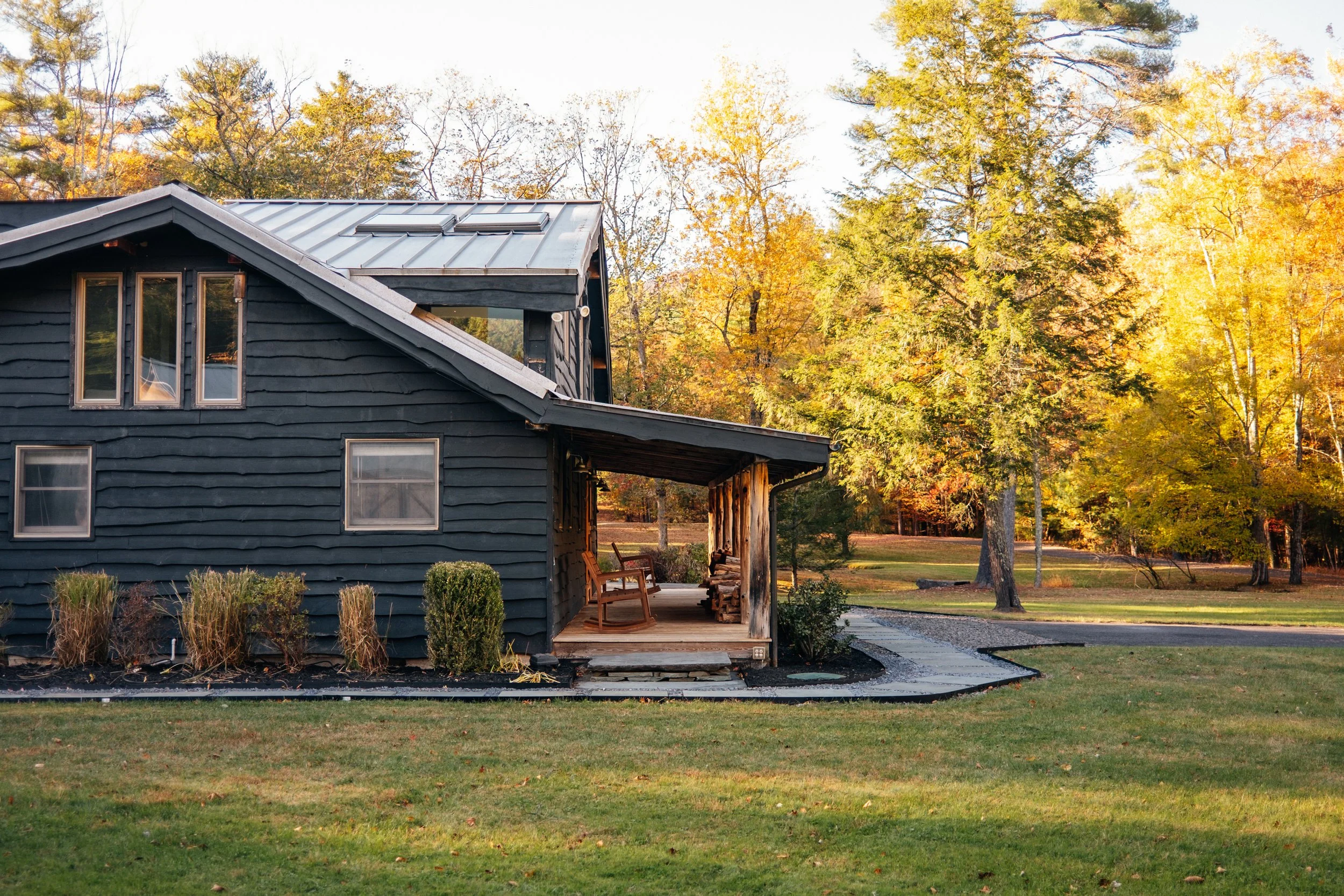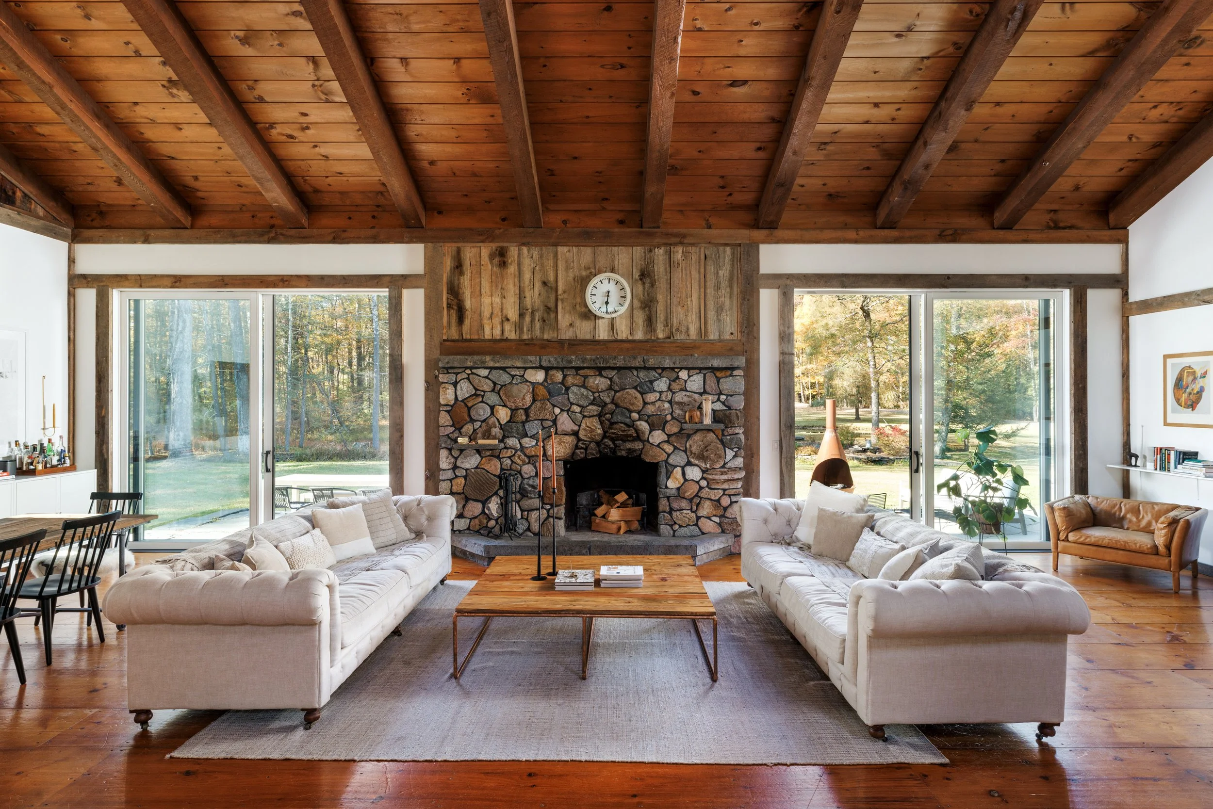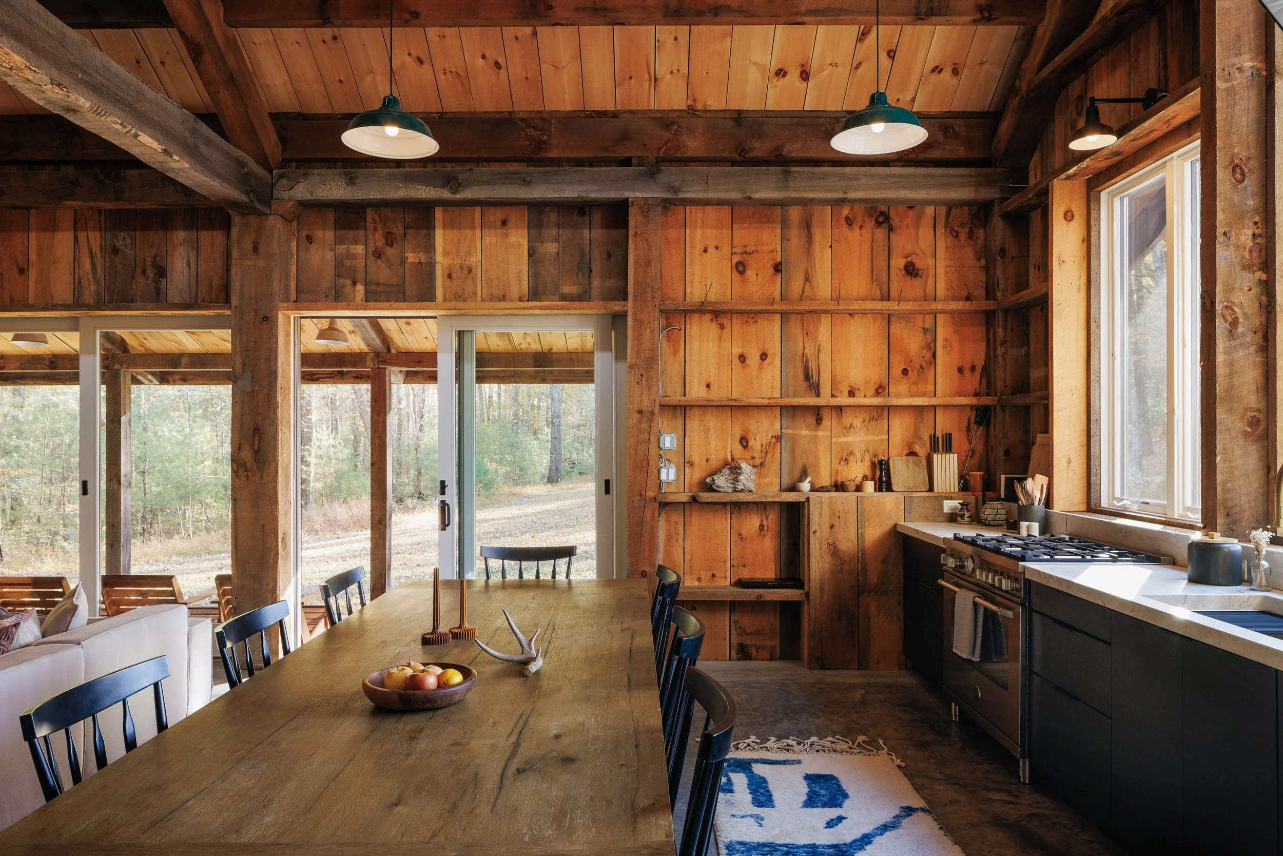 Nestled amongst the trees is a newly renovated guest house. Known as the “Sugar Shack”, it was once a barn where maple syrup was made. The structure has so much character having preserved much of the barn’s interior woodwork and shape while at the same time being essentially a new build. Complete with a new slab, new roof, radiant heat concrete floors, 30’ cathedral ceilings, a wood-burning stove, split units, new glass sliding doors, and an open modern kitchen with large windows framing spectacular views of Overlook Mountain. The Sugar Shack is nicely situated at a distance from the main house, so it’s perfect for rental income and has been successfully run as such.