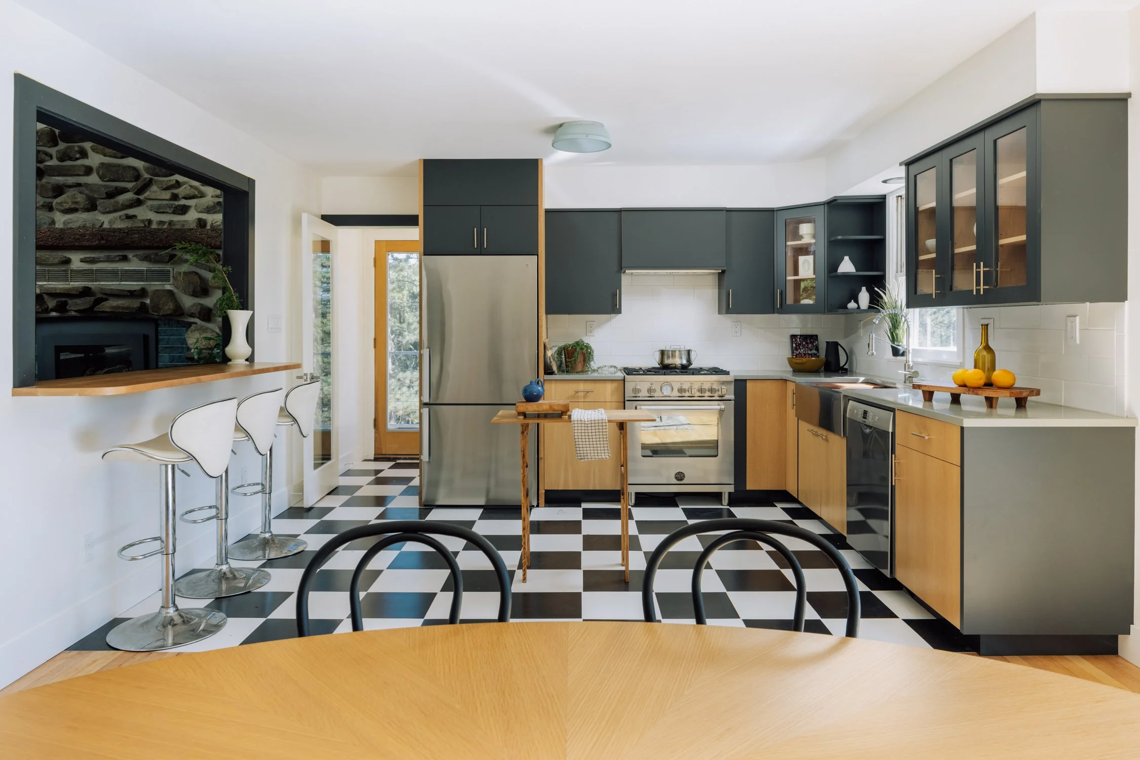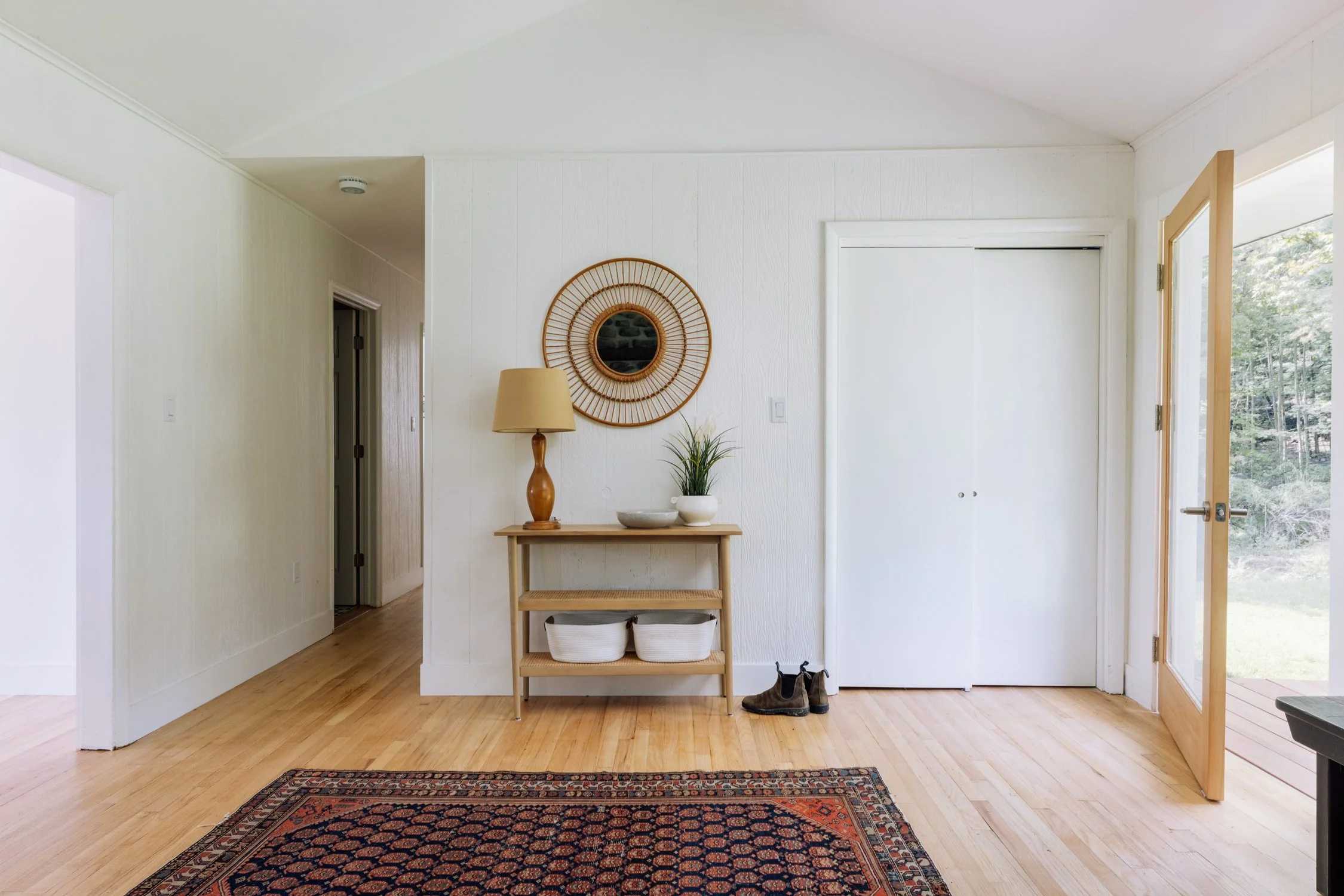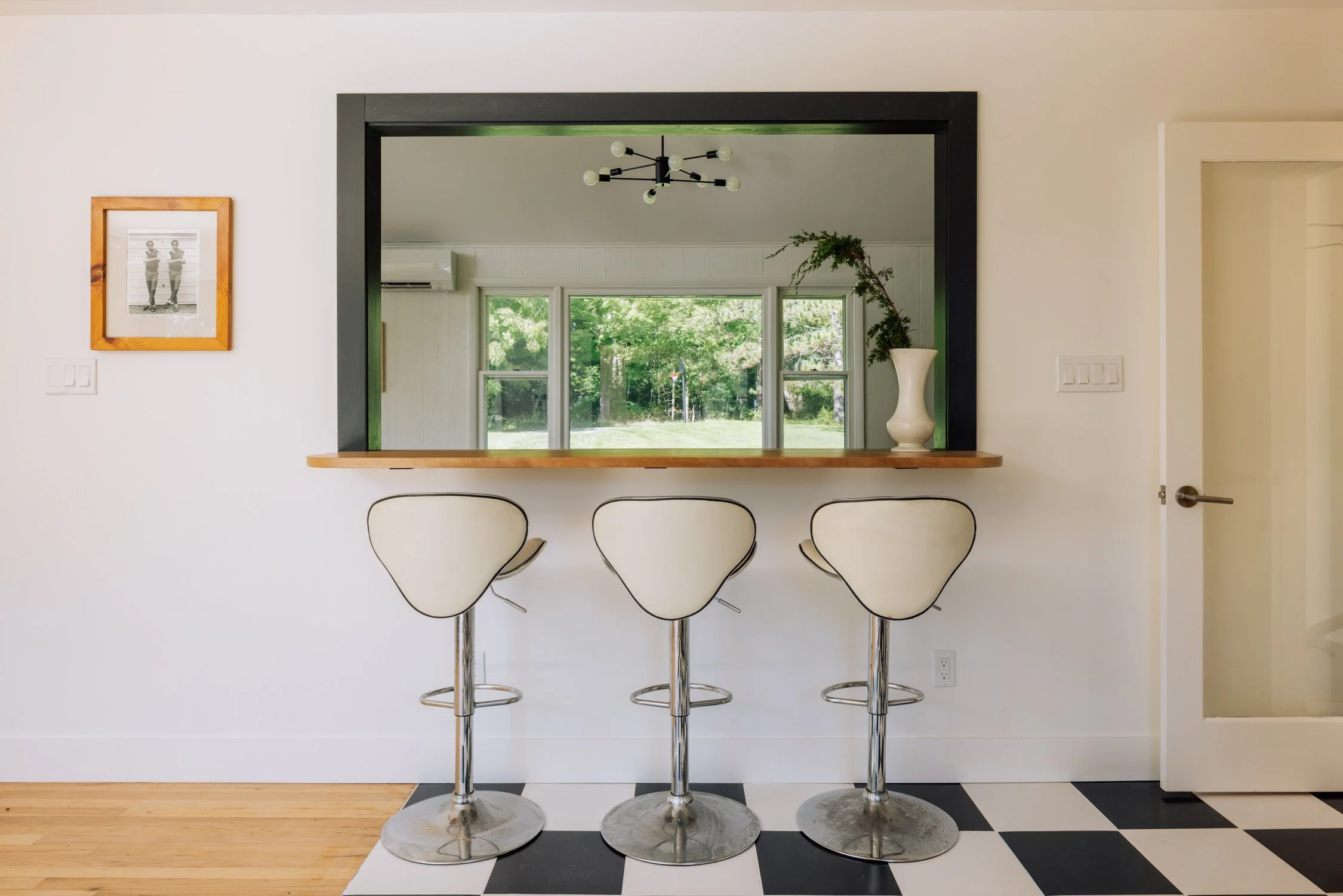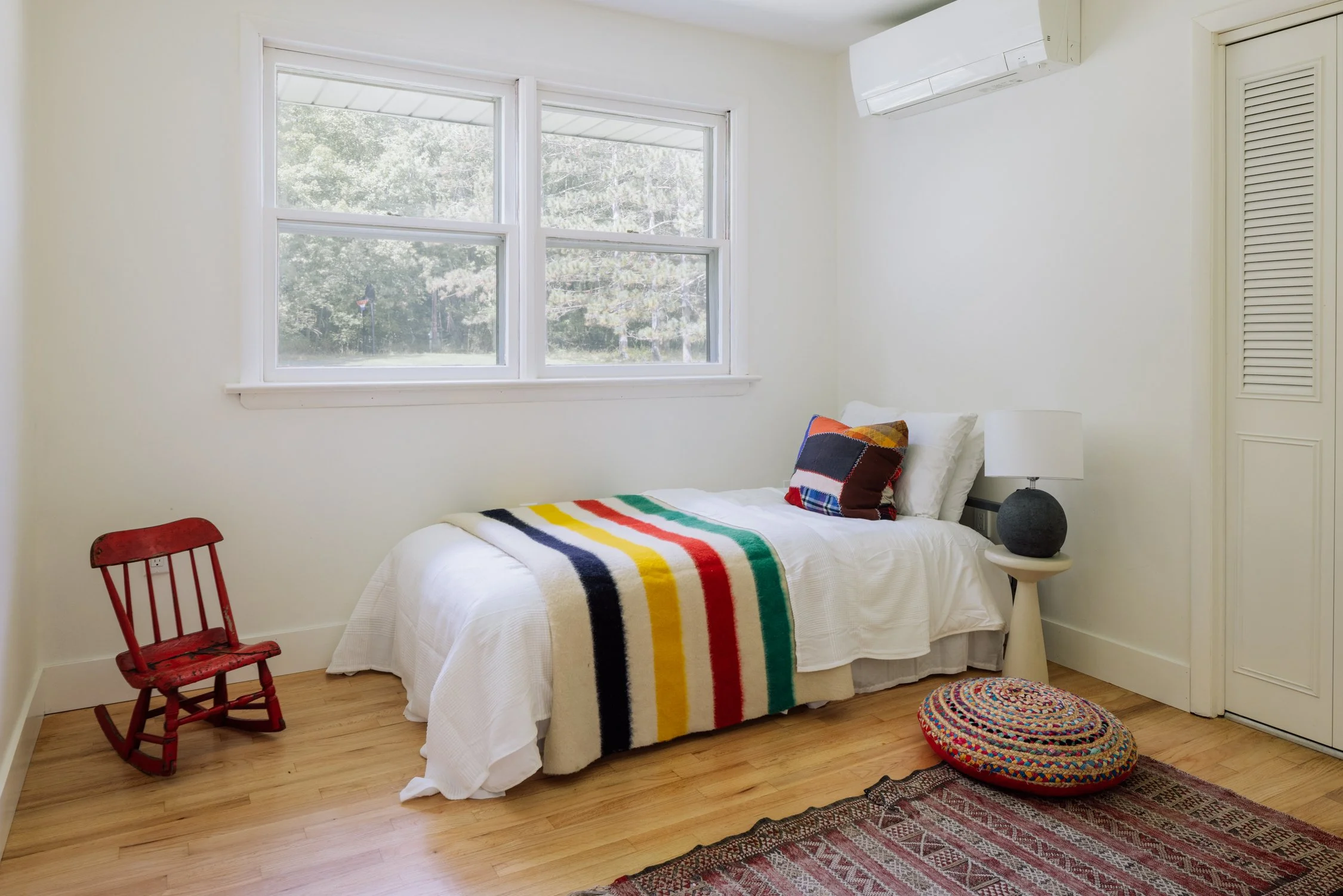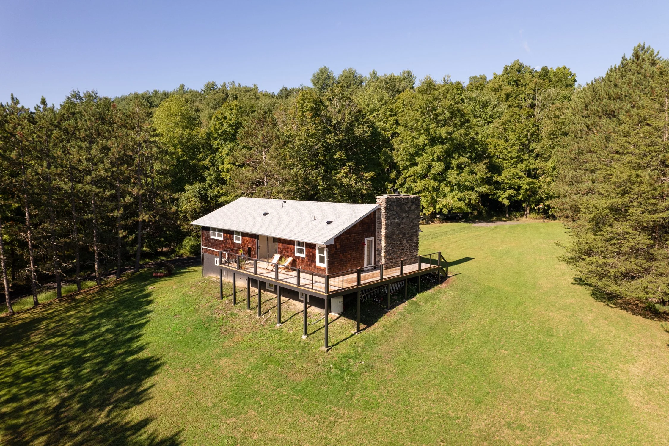 Cozy up fireside by the impressive stone hearth, pass cocktails across the custom cherrywood bar, or dine al fresco on the expansive wraparound deck with views of surrounding open land and pines. The kitchen is a chef's dream and includes Bertazzoni and Bosch appliances, custom cabinetry, and quartz counters. At the opposite end of the main level you'll find the primary bedroom, two additional bedrooms, and a second bathroom. Downstairs a light-filled open concept bonus space includes a laundry room/mudroom with easy access to the heated 2-car garage. This finished lower level offers many possibilities: additional living space for a family room, art studio, guest quarters, playroom, home office, gym, yoga studio, etc. Other features include freshly sanded and finished oak floors, new mini-split heat pumps throughout, a new water treatment system, a new roof with galvanized gutters, beautiful wood/glass front door, custom bookshelves and vanities, and all new electric/plumbing. Private well and septic. Two parcels totaling over an acre, with a large, open yard, plenty of space for a pool or garden. Private, serene and artfully restored - this one is move-in ready!