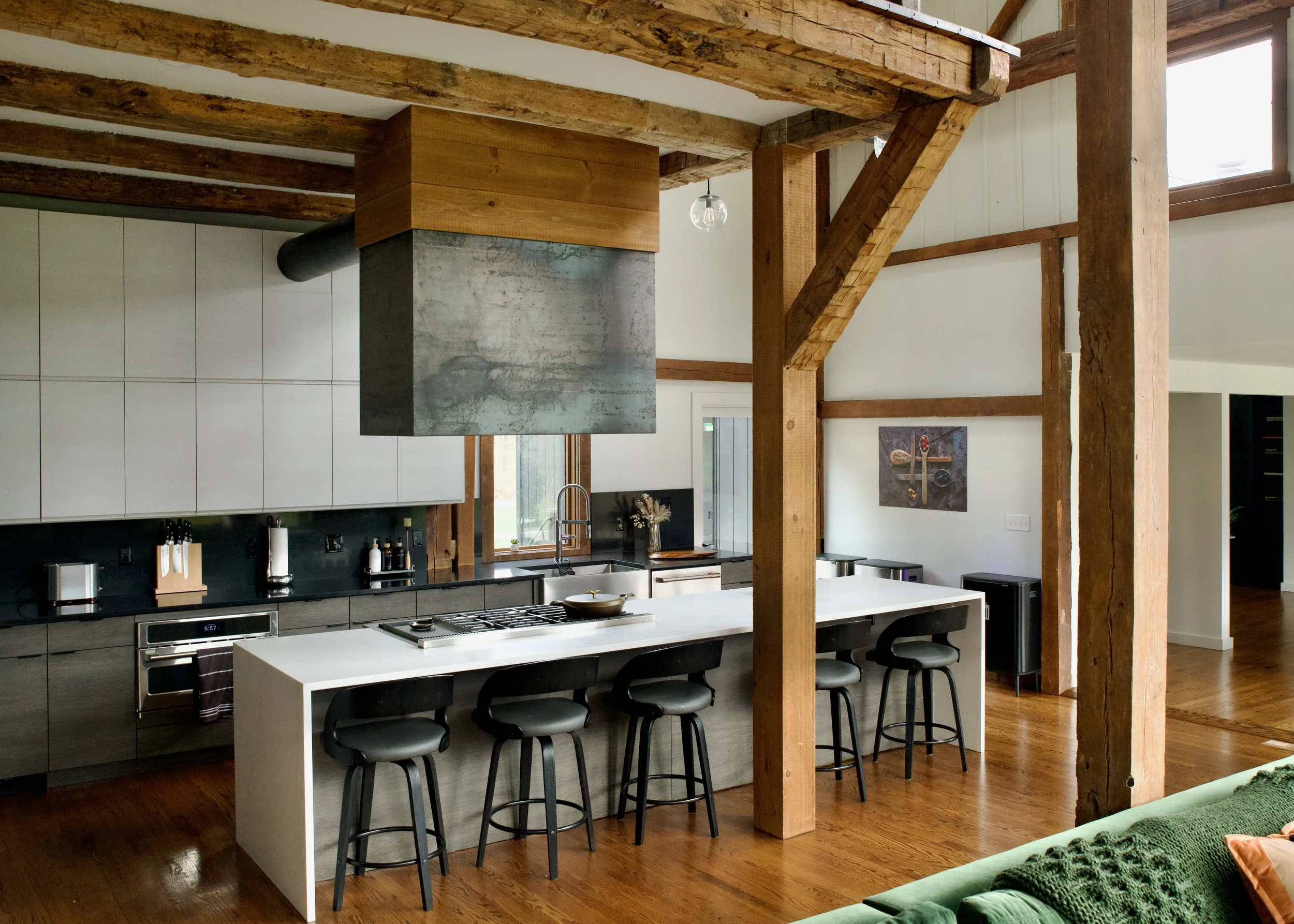 The home includes seven well-appointed bathrooms throughout. The primary suite is located on the main level, featuring a king bed and en-suite bath. The barn’s lofted upper levels are thoughtfully arranged across three tiers: the first loft level offers two bedrooms with a shared bathroom, comfortably sleeping six with two queen beds and a pair of custom bunk beds. One level up, an additional sleeping area with twin beds provides flexibility for guests. At the top level, a private bedroom with a king bed and en-suite bath offers a quiet, elevated retreat.