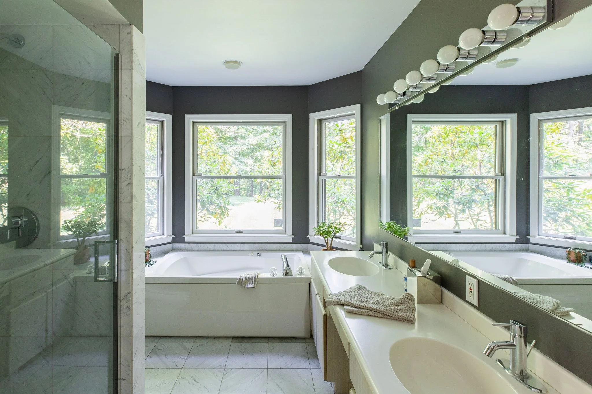The bright and airy living area welcomes you with vaulted, wood-paneled ceilings, a wood-burning fireplace and glass sliding doors opening onto an expansive rear deck and lush backyard. Adjacent is the skylit sunroom filling the space with abundant natural light. A generous eat-in kitchen is equipped with ample cabinetry, long slick countertops, and bar seating - ideal for daily living and entertaining. The generous primary suite includes a walk-in closet and a luxurious marble bath with a soaking tub and separate shower. On the opposite side of the home, two additional bedrooms and a full bath provide privacy and comfort for family or guests. Across the yard is the long lap pool positioned to enjoy plenty of sunlight throughout the day.