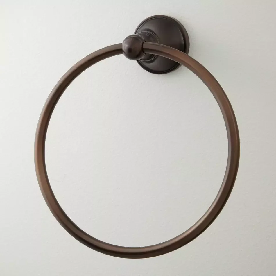 An oil-rubbed bronze faucet and other aged brass accents like the accordion mirror and sconce complete the look for an all-around sophisticated, lived-in look. Another layer of warmth is added with the addition of linens (think hand towels, bath towels, and bath mats) in shades of brown.